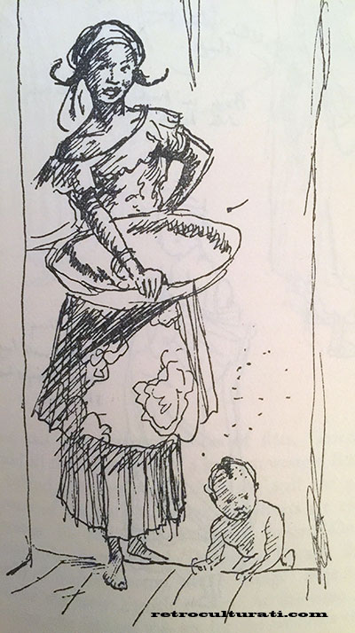 He clearly enjoyed drawing the women of Dakar as there are several towards the end of the book, he explains the difference between the younger women and their older relations; “As young women, these Negresses frequently have beautiful figures and carry themselves superbly, but the older women are inclined to stoutness, and often wear voluminous, billowing one-piece robes which exaggerate their girth.”