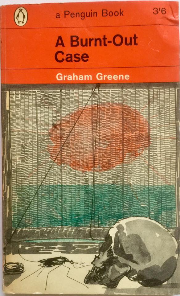 In an earlier post I outlined Paul Hogarth’s career, he led a colourful life and his extensive travels must surely have influenced his artwork and most especially for Greene. The original orange edition Penguin paperback covers are my favourites and in my opinion, his best. His brilliance was his ability to absolutely capture the spirit of the book in one drawing. They were direct in their approach, capturing Greene’s landscape and portrayal of his characters. In A Burnt Out Case (Penguin 1963) the story is set in a leper colony in the Belgian Congo, Hogarth’s depiction of a skull in front of a flimsy window blind and a blazing sun gives fair warning for the story ahead. We know we are in for a typically Greene-style depiction of colonial life in far-flung places: “The air in the hospital lay heavily and sweetly upon them: it was never moved by a fan or a breeze. Querry was conscious of the squalor of the bedding–cleanliness was not important to the leper, only to the healthy” You get the idea.