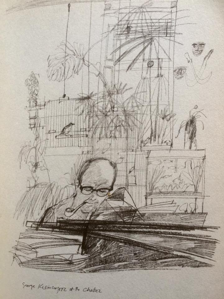 My final choice from this beautiful book is Hogarth’s drawing of the composer George Kleinsinger at his piano in his penthouse at the Hotel Chelsea. Behan describes how Kleinsinger kept an aquarium, three snakes and birds which were free to fly around his apartment at will.