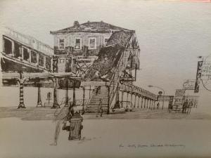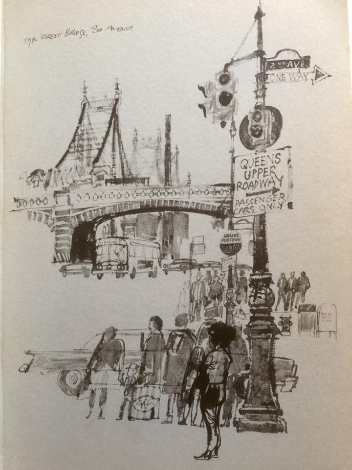 Paul Hogarth described New York as a ‘lovable jungle which gives me a charge a minute’ and he spent much of 1962 and 1963 drawing some wonderfully evocative images of daily life on the streets, in the bars and factories as well as buildings representing America’s early history. According to Hogarth he was lucky to get into America and where it not for Behan’s popularity with one of the Irish-American CIA officers who interviewed Hogarth about his previous communist party involvement he might have been denied entry.