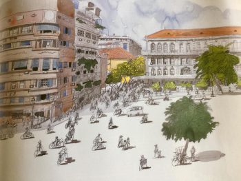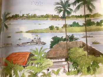 One of Greene’s greatest settings was of course Vietnam for the remarkable The Quiet American (1955)  Hogarth chose to stay at the Independence Hotel (formerly The Caravelle, and now renamed as so?) the popular meeting point for journalists during the war. This painting is of Place Garniernow known as Lam Son Square in Saigon which moved Greene to comment on the amount of cyclists which tear through the city every day. Reading Hogarth’s diary it is clear that 1980s Vietnam does not  sit well with him and he is glad to leave. There is however, an interesting painting of Dakow Bridge, the place where Pyle’s body is found. Greene wrote in his notes that he had never seen the place which Hogarth painted of  the actual scene “for it would have been suicide in those days to  cross the bridge into that  part of Saigon”