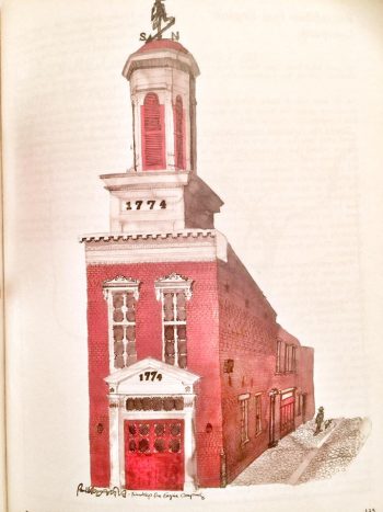 Take the painting of the Friendship Fire Engine Company Firehouse opposite, Hogarth tells us this was home to the earliest group of volunteers established in 1774 which boasted members from Presidents to governors and local celebrities. It is a wonderful building which was built in 1855, Hogarth reveals George Washington himself was a volunteer and donated a hand-pump fire engine from his own money. The importance of the fire engine cannot be overstated, in the eighteenth century little was more feared than fire and by the early 1750s the town had ordered that all wooden buildings were to be replaced with brick and stone to prevent any further outbreaks. As a painting love the red brick colouring and the shadowing on the side of the building, Hogarth cannot resist the addition of a dog walker on the cobbled street.