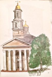 Seven routes and sixty one paintings make up this lovely volume which takes in The White House and its neighbourhood, Capitol Hill, Downtown, the Mansions of Massachusetts Avenue, Georgetown, Mount Vernon and Old Town Alexandria. Once again Hogarth includes his own maps and notes detailing distance, walking times, addresses, opening times and phone numbers. There are details of the metro bus, advice on the weather and duration of one’s stay. It is written in the same unique style as his paintings, creating a charming picture of fabulous colonial architecture, leafy avenues and fine churches.