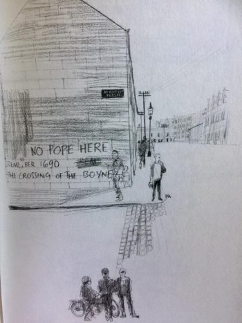 The drawings beautifully reflect Behan’s Ireland, his caricatures depict the working class culture of the country in the early 1960s with its sense of camaraderie and boisterous celebration of national identity. The drawing opposite reflected the troubles of the period and how the graffiti strewn walls stood alongside the buildings and landscape of an Ireland rich in history from centuries past. It is this deep sense of history and the importance it held in Behan and his associates hearts which comes through time and again in both the narrative and the drawings, that Hogarth, as an outsider was able to capture scenes and characters which reflected that is to the credit of his memory as an artist. So often, Hogarth’s sense of restraint and perceived simplicity of lines do so much to give a sense of the time, his portraits of the working class across the globe show the realities of life in the middle part of the twentieth century and for many, such as those in Ireland, it was far from easy.