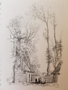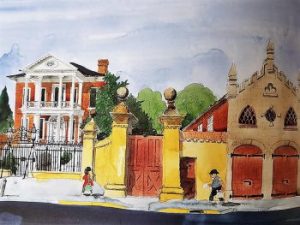 Opposite is one of his later drawings from 1984 of Miles Brewton House in Charleston. An ink, pen and watercolour of Brewton’s colonial mansion and one which typifies his work in recording some of America’s finest architecture. Hogarth loved architecture and the history behind the buildings, he wrote beautifully and concisely and offered these words in relation to his travels: ‘The exploration of artists, unlike those of tourists, are sometimes rewarded by the discovery of places not mentioned in the guidebooks. Artists also discover subjects of remarkable interest overlooked or unnoticed by more academic observers, although such deviations are bound to get them into trouble sooner or later’.