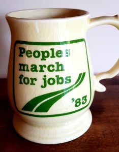 Unfortunately for the organisers the march did not grasp the sympathetic attention of the public in the way that it had hoped. The turn out of well wishers was lacklustre and the closing rally was far short of the figure predicted by the unions. But whatever the side of the political debate it should be remembered that this wasn’t a Trotskyist day out, there were people who genuinely feared for their future during a very uncertain time and unemployment brings with it many unpalatable consequences. This mug is a reminder to me at least, that there were people willing to leave the comfort of their armchair to protest against what they felt was a rapidly changing social environment and of a time before politicians scrambled for the centre ground leaving their past beliefs and loyalties trailing in the wind. Most rallies do little to alter political decisions but they do act as a reminder of the democratic process and more importantly, the bravery of those held in countries where democracy was and is a pipe dream.