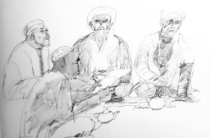 A two thousand mile flight from Moscow brought the pair to Samarkand and the beginning of their journey into Soviet Asia. This brings to light the sheer size of the country and how varied the landscape and peoples are. The influence of the Arabs is particularly evident in Bukhara and Hogarth captures the magnificence of the architecture quite brilliantly. In the close company of what they believed might have been a German spy they devoured a hearty dinner in Samarkand: “…a clear soup with meatballs, shashlik, salad and delicious unleavened bread. We drank vodka and two bottles of Uzbek rosé. The bill came to £1 5s each”
