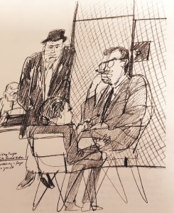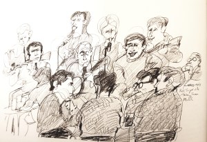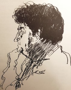 Hogarth loved good food and wine and so it is no surprise that one chapter is dedicated to drawing people in bars. Some of his best ‘group’ scenes are those set in the bars of Ireland, London and America. Hogarth tells the reader to observe basic bar etiquette, a sensible precaution given some of the haunts he visited. I love these drawings, they hark back to a golden era for the public house, when they were places to drink and be merry, where characters roamed and conviviality abound. We lost much when the bars became eateries with ‘2 for 1’ and ‘kids go free’, it was a space for conversation and escapism from the week’s labour and Hogarth captures the characters which were the very essence of the pub scene. It’s quite depressing actually. This drawing was of folk singers at the Abbey Tavern in Howth, Ireland in 1969, one can easily imagine the beer flowing that night.