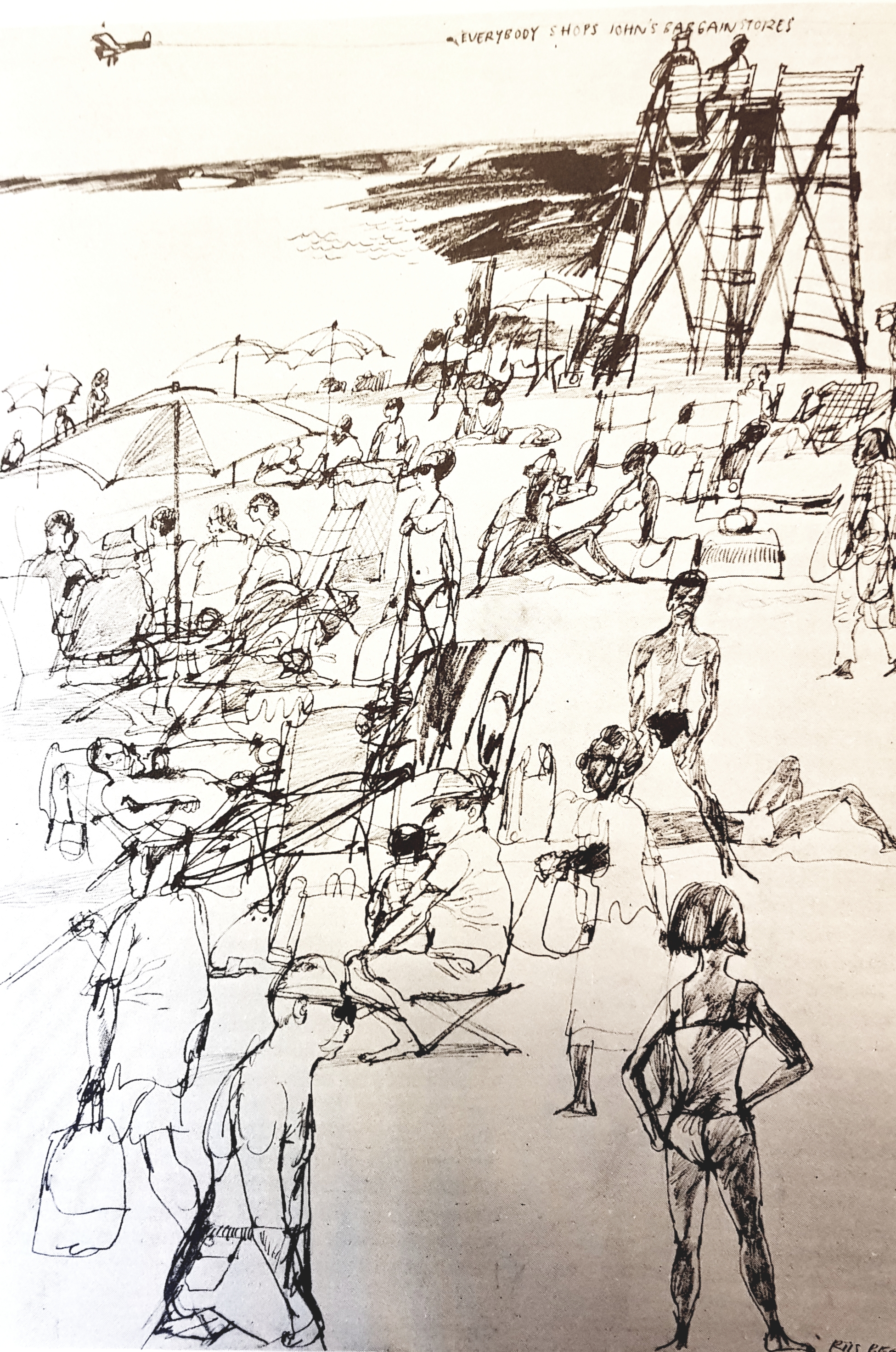 Opposite is a reminder of happier times; Riis Park in New York in 1963. Hogarth recalls how, one September afternoon he built the picture up over two hours of continual movement of people of all shapes and sizes. He states that drawing on a beach is more impersonal and nobody asks you questions. I would have thought that would have been the opposite!
