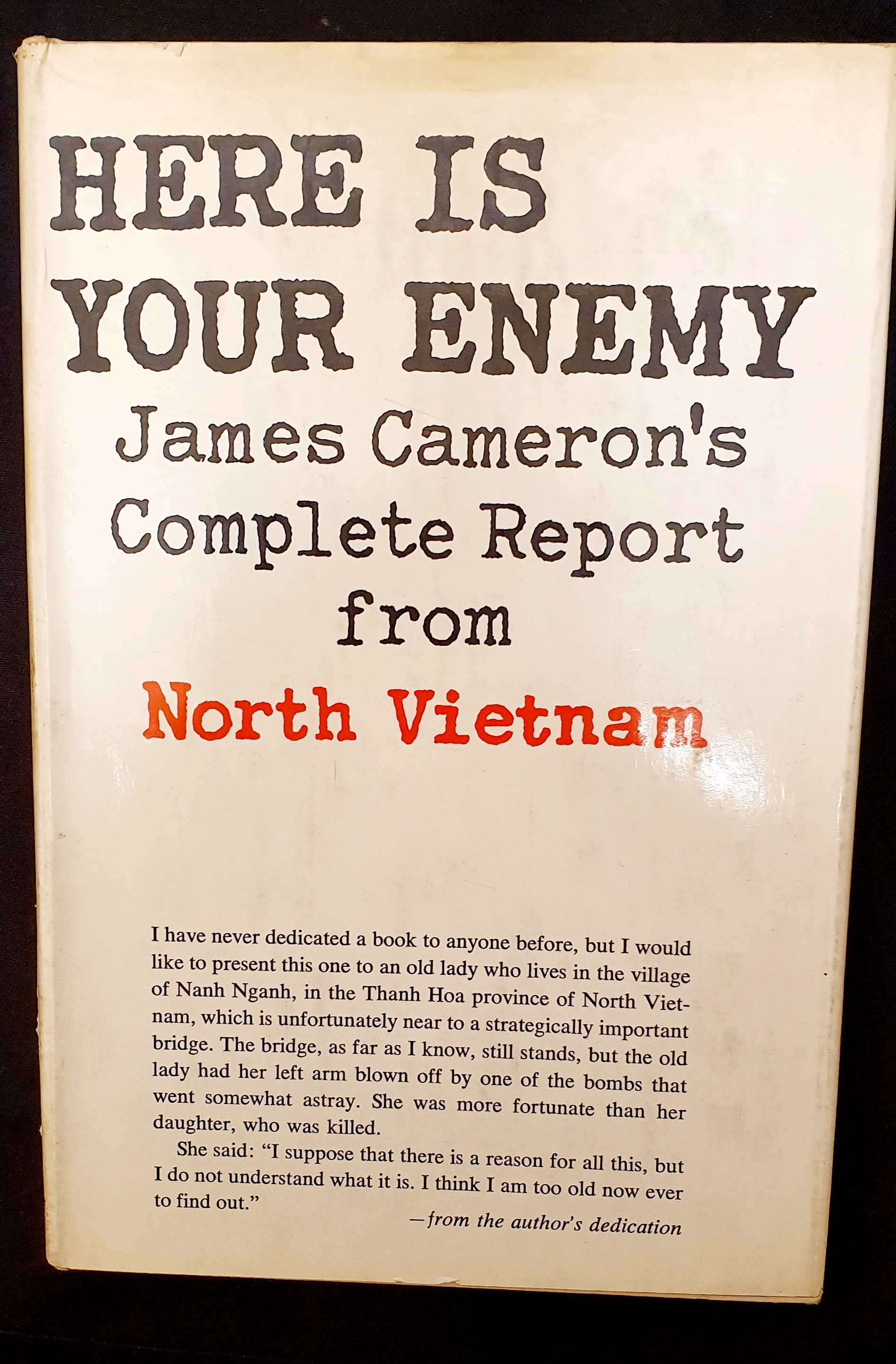 I truly believe this book to be of great importance in the documenting of the Vietnam War, when American journalists saw their work being ‘edited’ to placate the readership as the war progressed and worsened, Cameron was able to deliver a true, independent view of the situation in the knowledge his book would be published without editorial tampering. That parts of it were published in The New York Times as well as in full by the American publisher Holt Reinhart Winston shows the state of the war at that time.