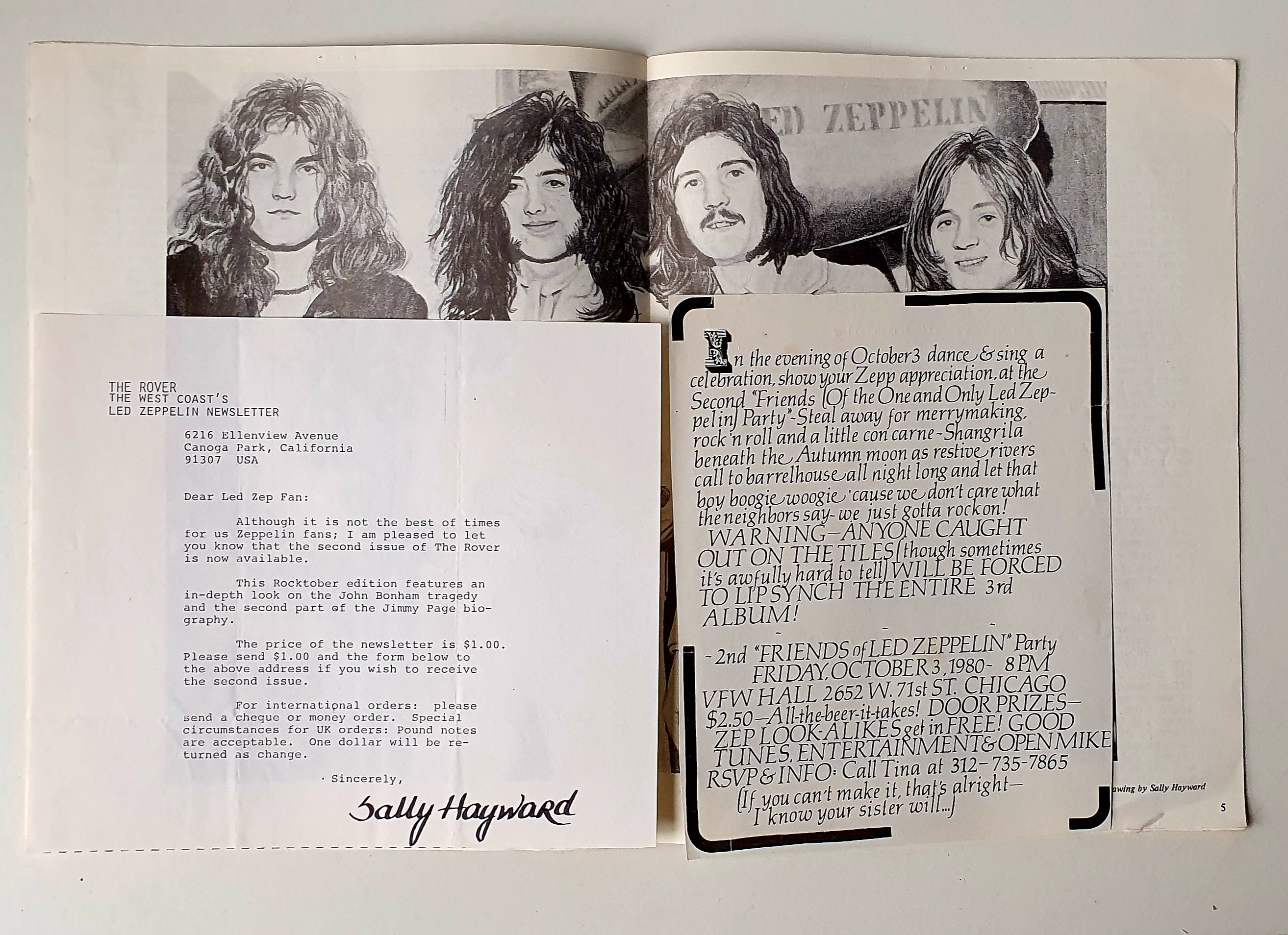 Thought I would share a rare piece of rock memorabilia with you: The Rover was a short-lived newsletter/fanzine dedicated to Led Zeppelin. First published in July 1980 , it was the first of its kind from the West Coast of America, the country which turned the group into superstars. The publisher, Sally Hayward included centrefold drawings by her of the band in each issue along with a Led Zeppelin related word search game.