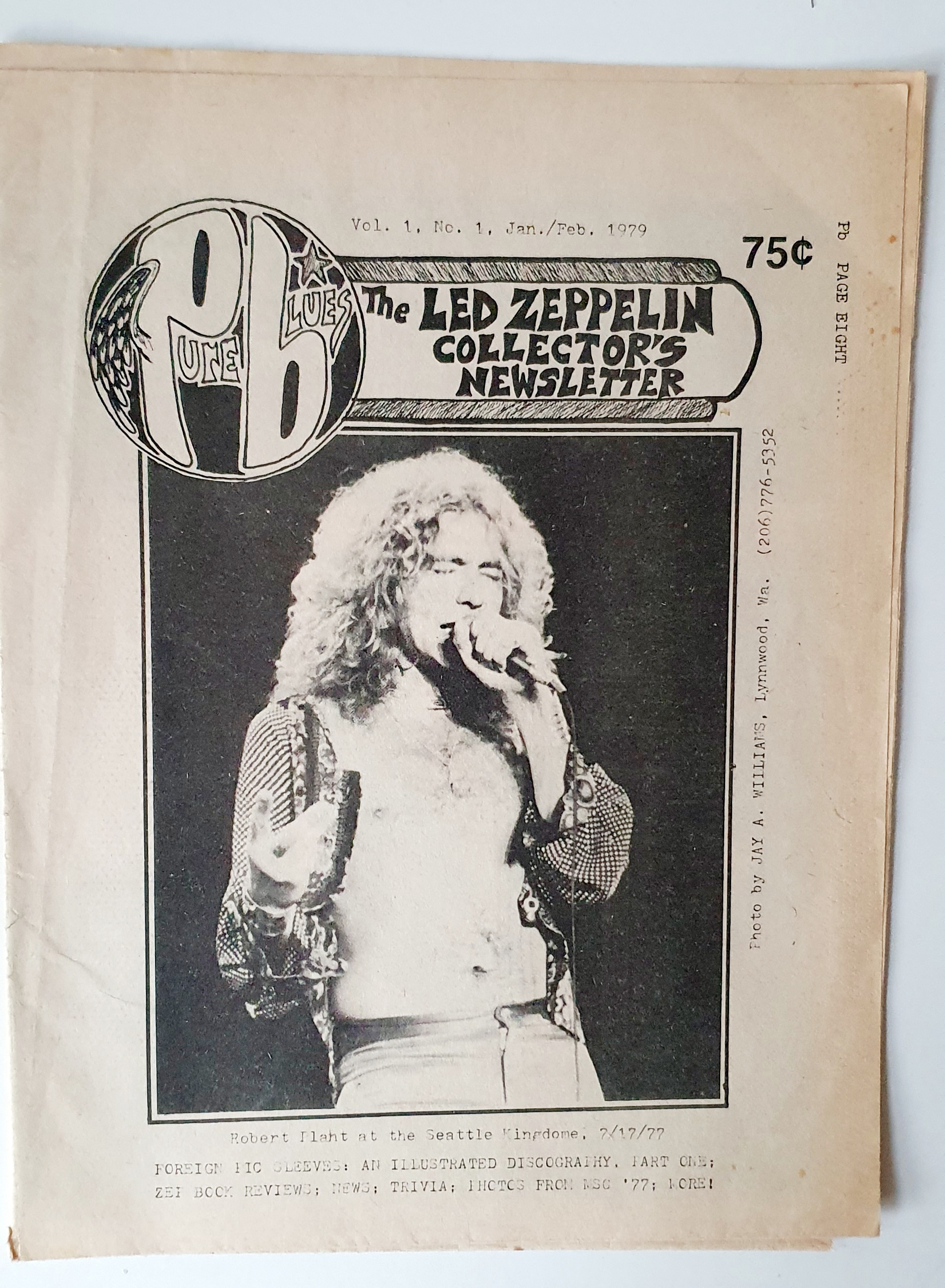 The first issue of Pure Blues The Led Zeppelin Newsletter was published in January 1979. Priced at seventy five cents, the front cover featured Robert Plant at the Seattle Kingdome during their famous tour of America in 1977. The issue contains a full page of photographs from their concerts at Madison Square Garden in ’77, three pages of foreign Led Zeppelin and related vinyl’s, book reviews and a letters page.
