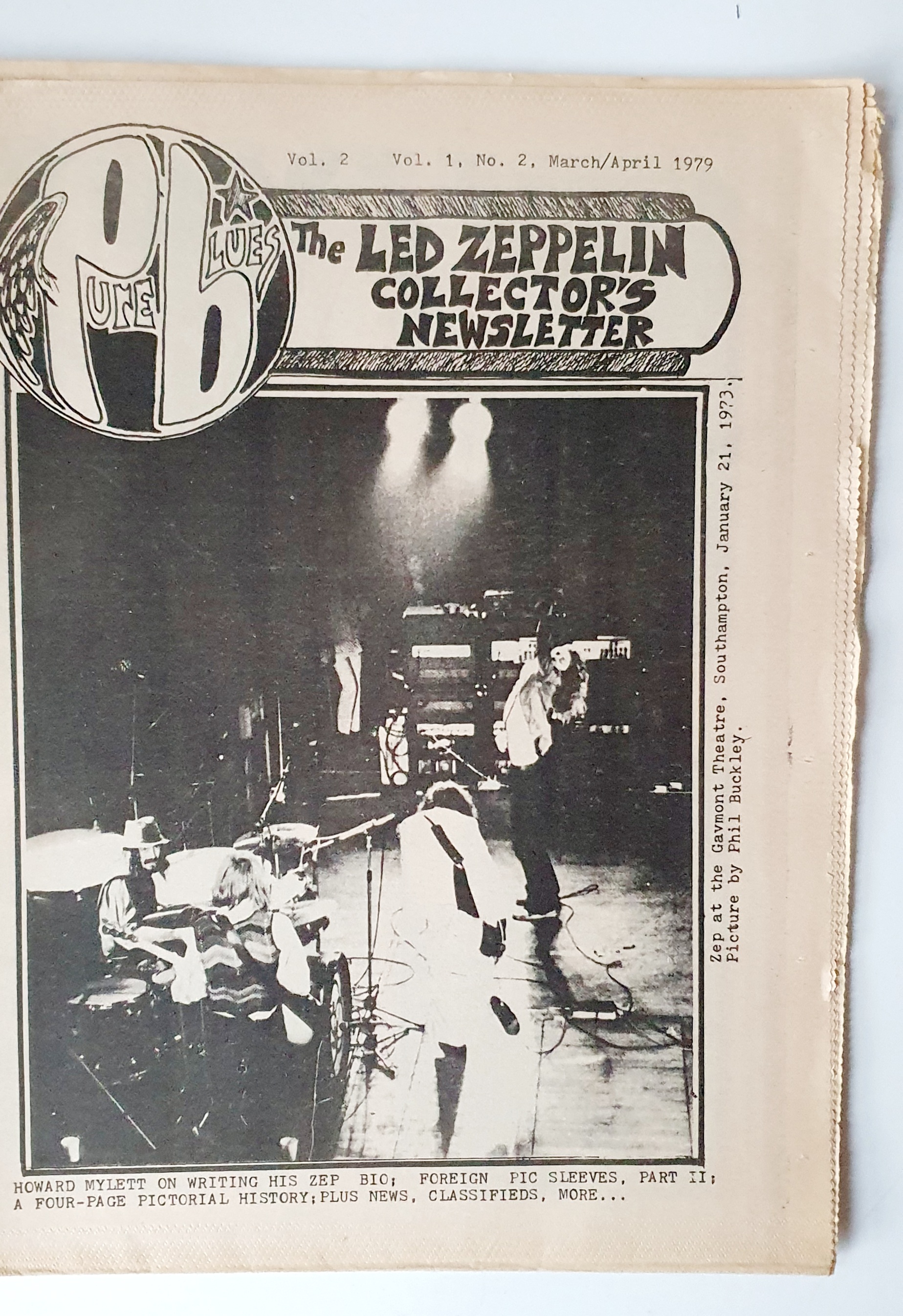 The second issue of Pure Blues The Led Zeppelin NewsletterIn the second issue there is an interesting article written by Howard Mylett who wrote a biography of the band, Mylett, from England was a huge fan and authority on the band and built a formidable collection of Zeppelin memorabilia. Also included are pages of photographs detailing the band’s rise, many of which I have never seen before. The front cover features Phil Buckley’s photograph of the band playing the Gavmont Theatre in Southampton, England in 1973.