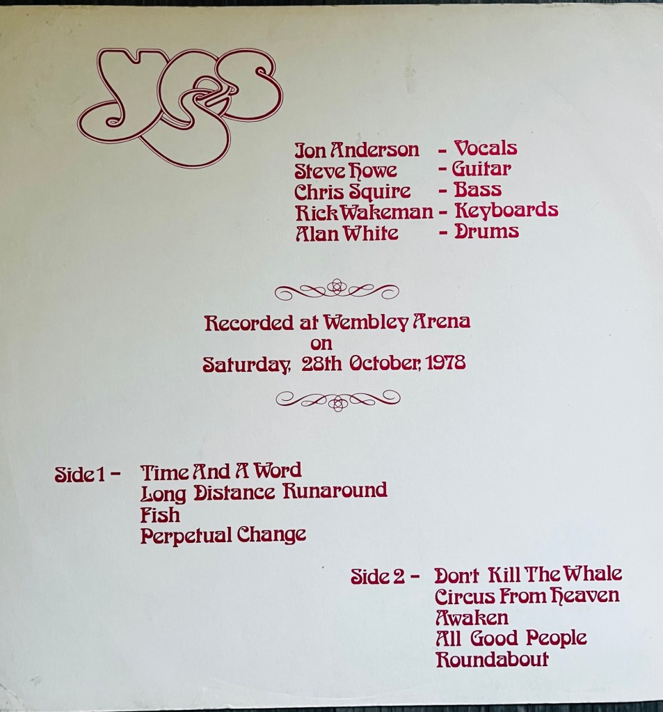 Many years ago I bought this bootleg vinyl at a record fair. It was a live recording of Yes at Wembley Arena during their 1978 Tormato tour. This was in an era of very limited access to music other than official album releases, tours and the occasional television appearance depending on the music so obviously Yes were not exactly mainstream.