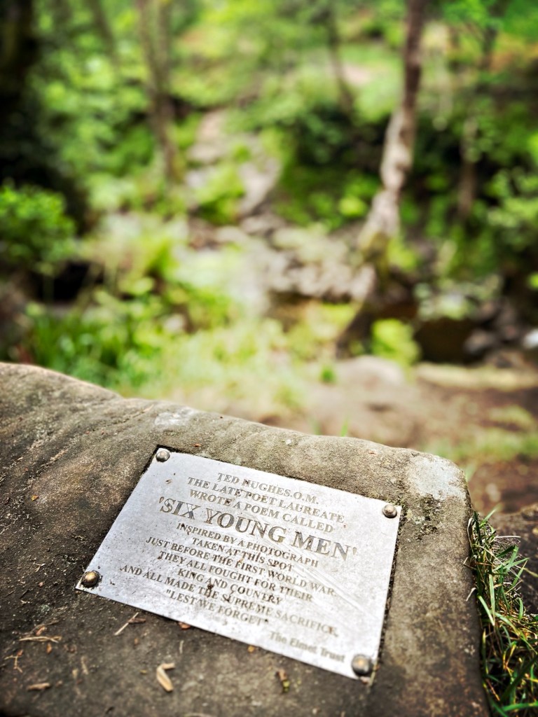 Today I visited the spot where the photograph above was taken. These six young men were photographed at Lumb Falls, a beauty spot with a small waterfall near Hebden Bridge in the Calder Valley area of Yorkshire, England. Six months later, they were all dead. Killed in action in World War One.