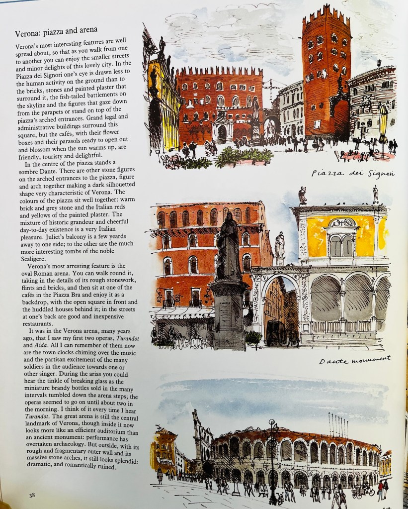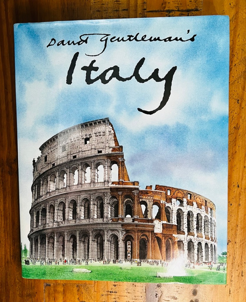 David Gentleman’s Italy, published by Hodder and Stoughton in 1997 continued the wonderful series of art based travelogues by the author through the 1980s and 90s. Having previously covered Britain, London, Paris and India, Gentleman turned his brush to Italy.