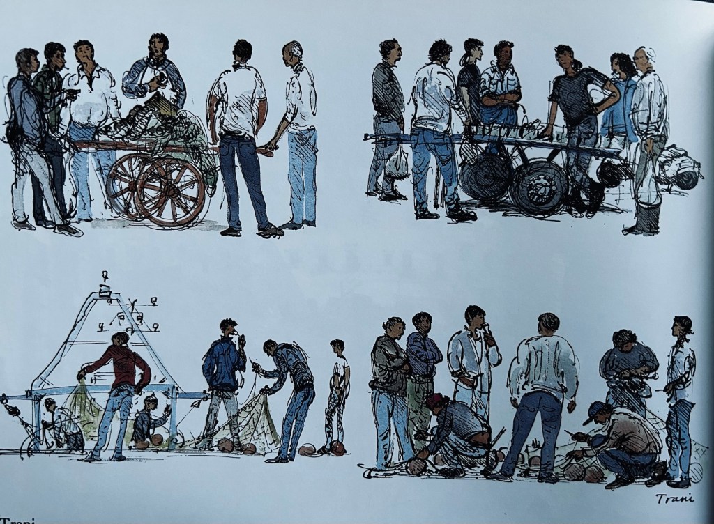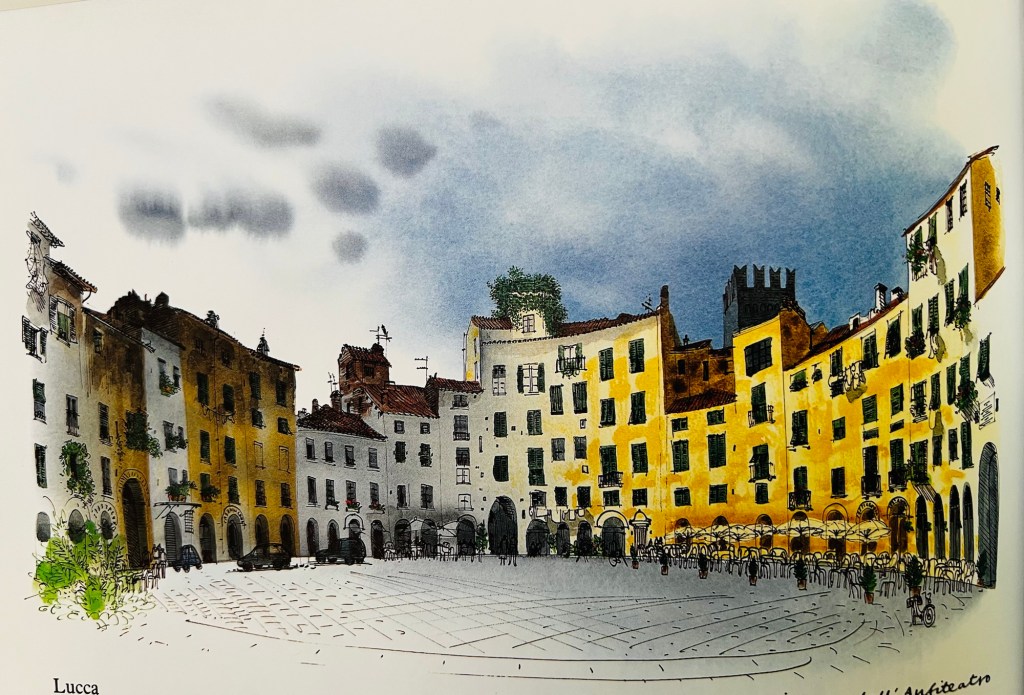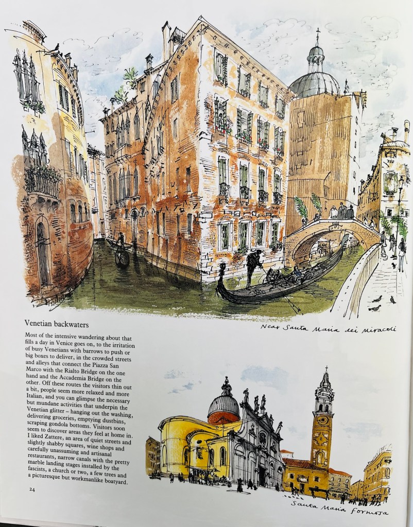 The book contains all of the classic picture postcard scenes one would expect but alongside those dozens of supplementary sketches and paintings of side streets, cafés, piazzas and people going about their everyday lives. He offers useful tips for the tourist to maximise their visit and in his introduction he gives the reader the good and the bad and when he points out the bad it is balanced and forgiving.