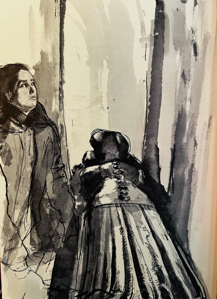 Inside is a wonderful painting of the cathedral which is half pasted down making it a charming addition to the book and the only colour plate featured. The rest of the artwork uses clever charcoal and water colour shading of blacks, greys and whites which perfectly captures the mood of the book.