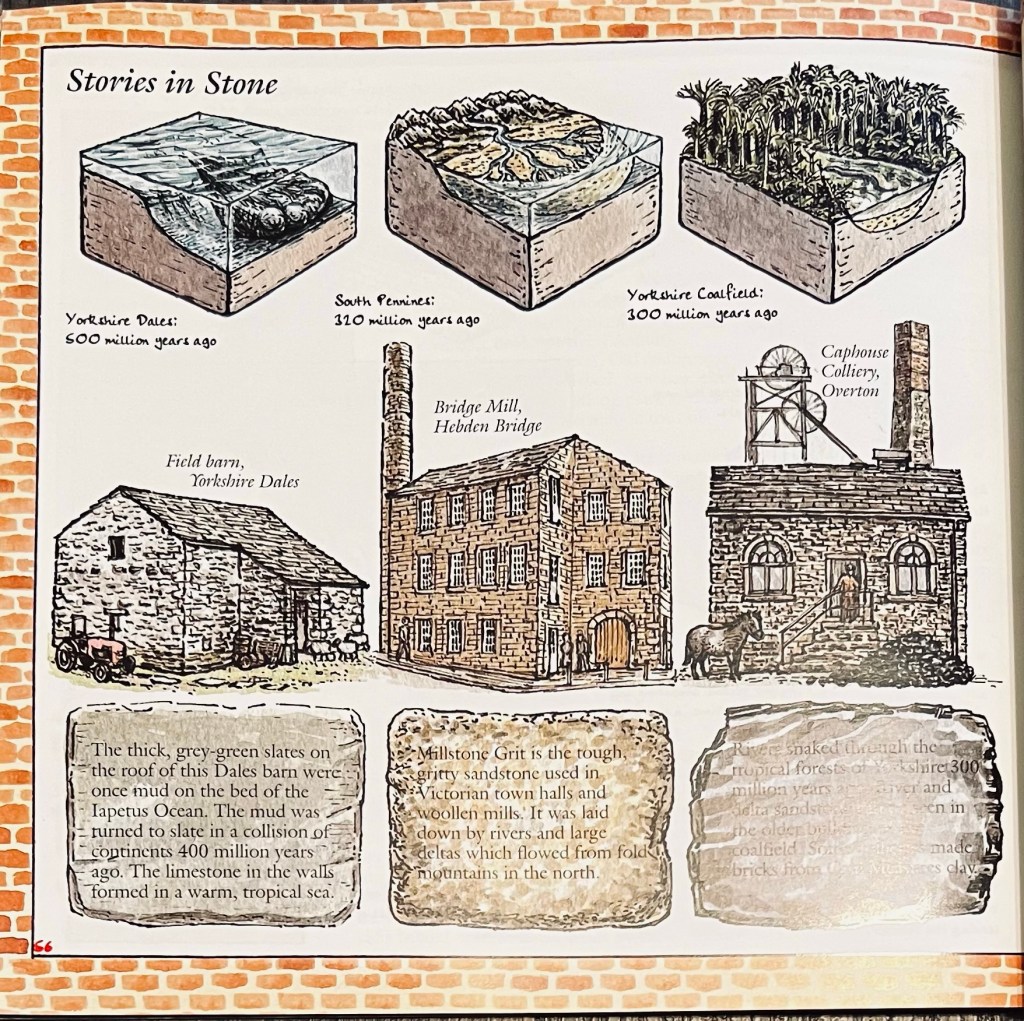 Bell manages to explain the geology of Yorkshire in a fun, easy to digest way. He draws the various rocks and minerals that make up the area beautifully and tells us to look at the rocks for clues as to what Yorkshire looked like before the advent of man: Barnsley: a steamy, tropical forest. Doncaster- a hot, sandy desert, Scarborough- the dinosaurs delta and York- sat in the shadow of a glacier.
