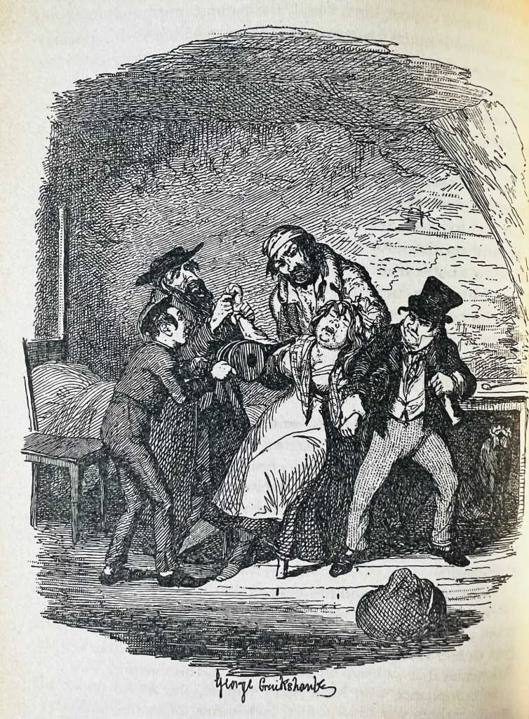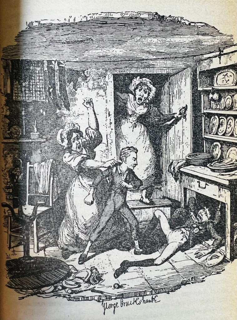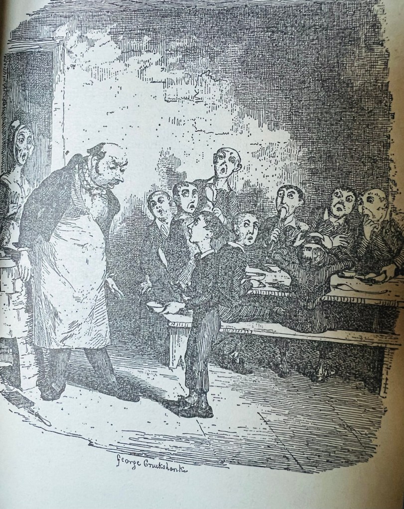 His illustrations for Charles Dickens feel like a marriage made in heaven and in this Penguin English Library edition we are treated to his original illustrations. The most iconic moment in the book and most especially the subsequent films, television shows and plays is when the young Oliver asks for more food and Cruikshank captures the moment perfectly..